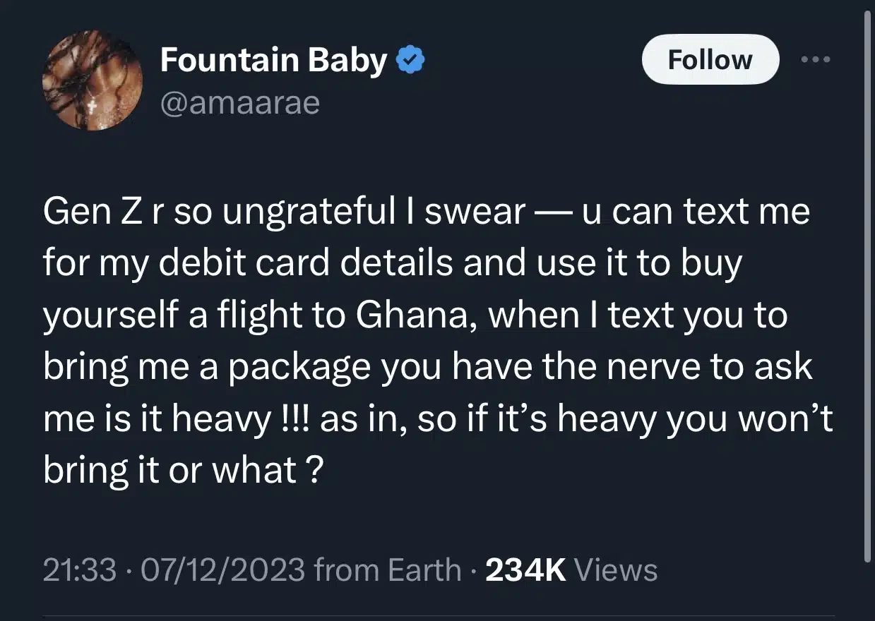 “Gen Z r so ungrateful I swear — u can text me for my debit card details and use it to buy yourself a flight to Ghana, when I text you to bring me a package you have the nerve to ask me is it heavy !!! as in, so if it’s heavy you won’t bring it or what ?”