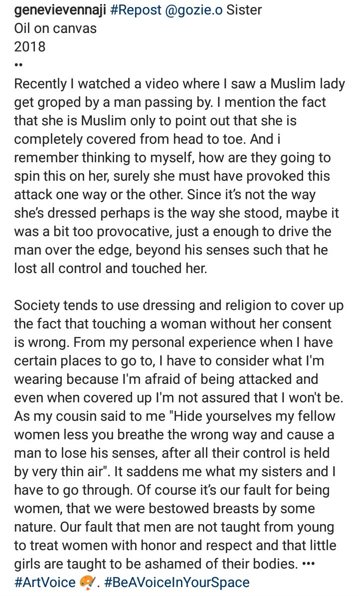 It saddens me what my sisters and I have to go through. Of course it’s our fault for being women, that we were bestowed breasts by some nature. Our fault that men are not taught from young to treat women with honor and respect and that little girls are taught to be ashamed of their bodies. ••• #ArtVoice ?. #BeAVoiceInYourSpace