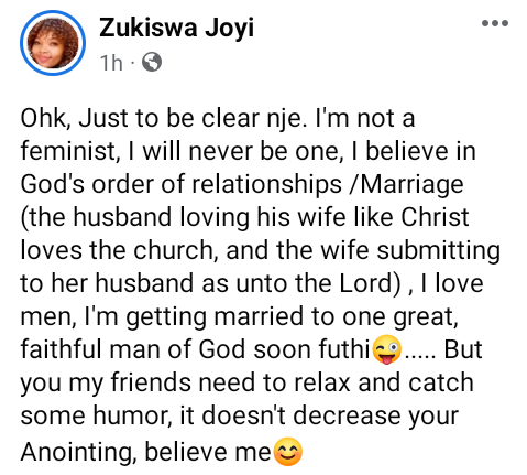 “Ohk, Just to be clear nje. I’m not a feminist, I will never be one, I believe in God’s order of relationships /Marriage (the husband loving his wife like Christ loves the church, and the wife submitting to her husband as unto the Lord) , I love men, I’m getting married to one great, faithful man of God soon futhi. But you my friends need to relax and catch some humor, it doesn’t decrease your Anointing, believe me.”