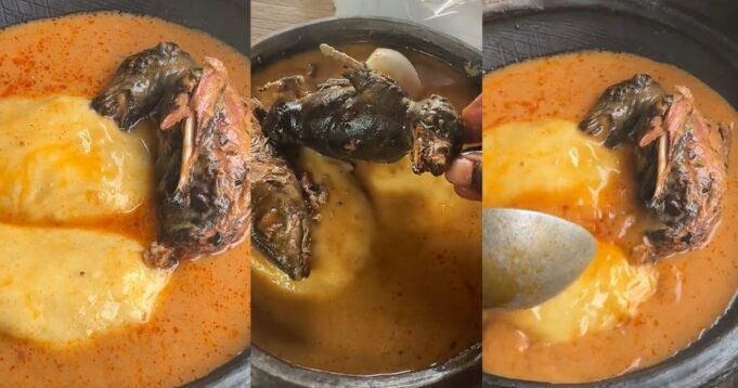 A Ghanaian man expressed displeasure after discovering a hideous protein similar to a bat in his soup at the best local Fufu plug his grandfather led him to.