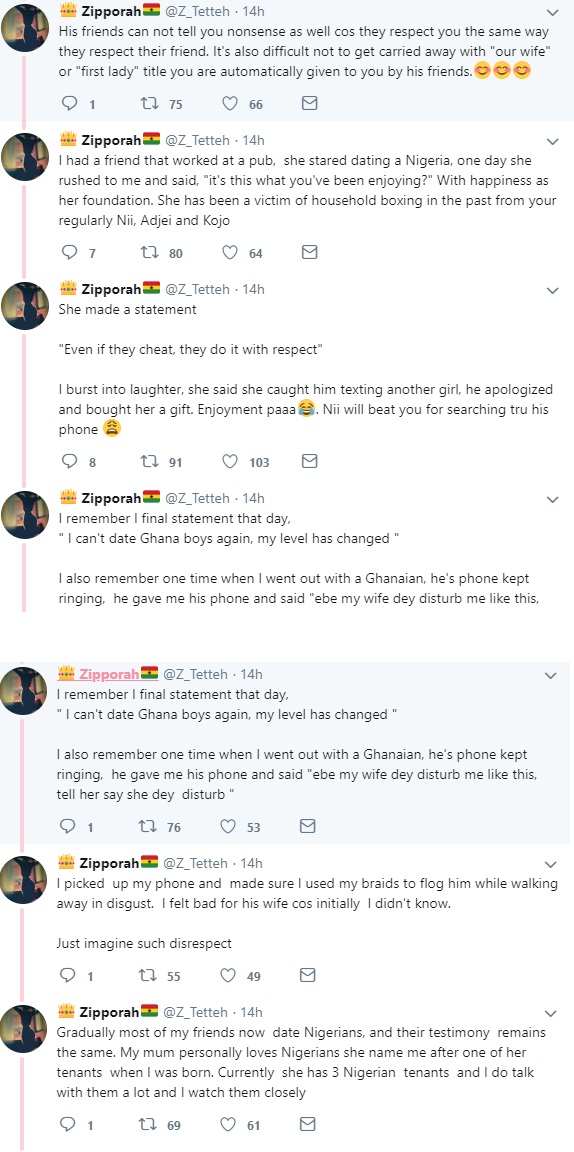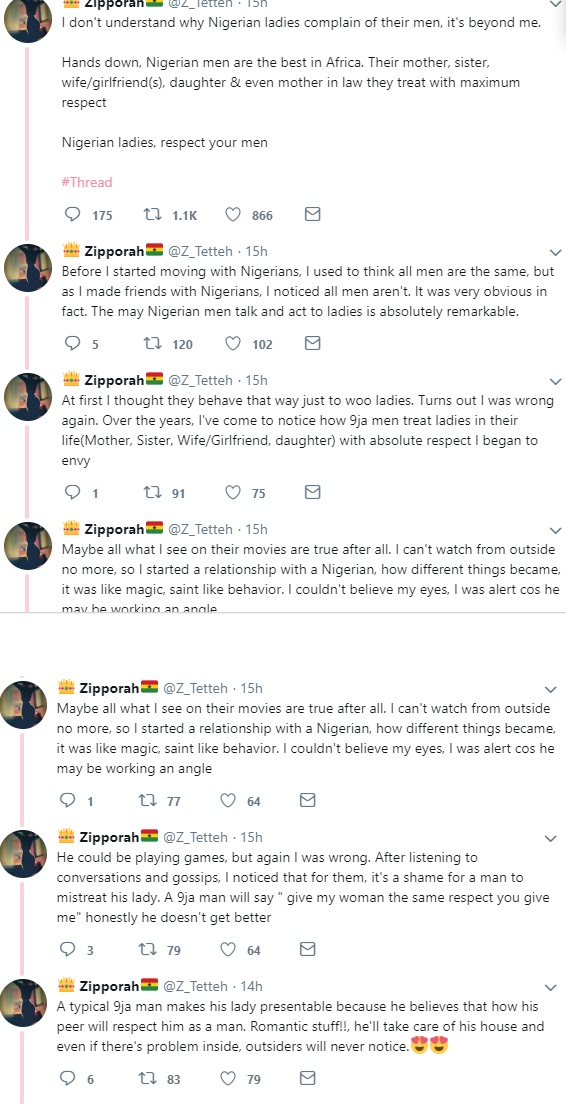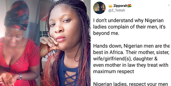 A Ghanaian lady has taken Micro-Blogging website, Twitter to pour enconium on Nigerian men, saying they are the best men in the whole of Africa.
