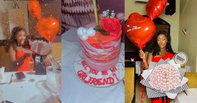 The video starts out with the lovely lady in a red dress while on a date with the gentleman and just as they are having a good time together in a fancy restaurant, the lady was presented with money roses, a card, balloons and a cake that had the inscription, “Will you be my girlfriend ?” on it.
