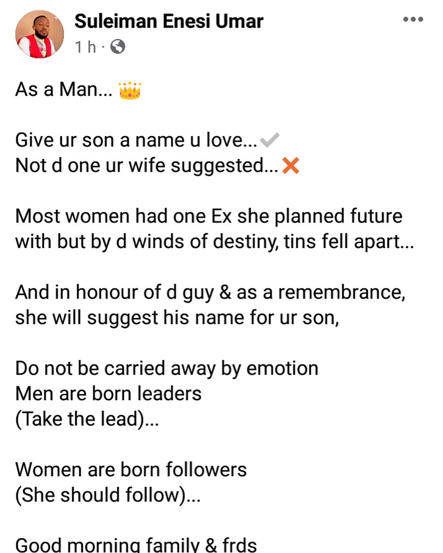 A Nigerian man identified as Suleiman Enesi Umar advised his fellow men to give their male child a name they love and not the one their wife suggest. He noted a man is born to lead and a woman is born to follow.