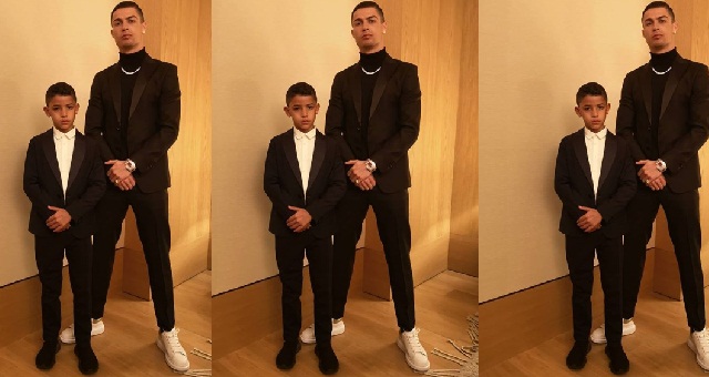 Juventus striker, Cristiano Ronaldo shared a good looking photo of himself and his first son Cristiano Ronaldo Jr. striking a pose in matching suits and we can’t help but tag it ‘father-son goals’.