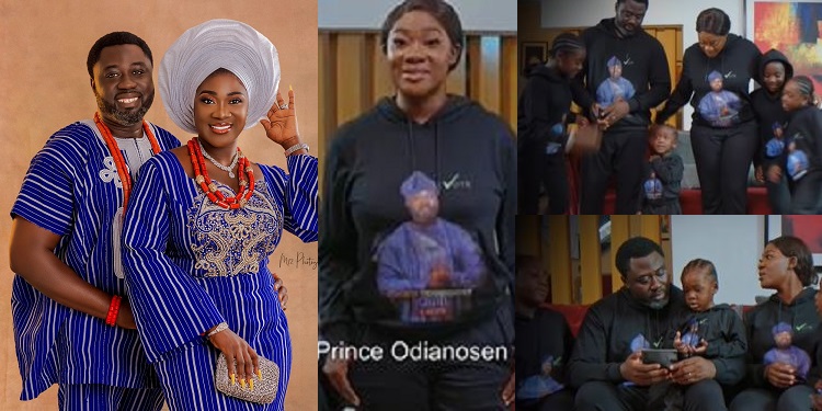 In the clip, Mercy, her husband, and their children all donned matching black outfits, which had her husband’s photo printed on them.