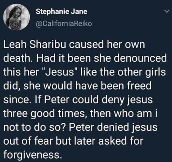 According to the Twitter user, Leah Sharibu should have denounced Jesus to save herself just like Peter did and beg for forgiveness after. She also blamed the Nigerian government for failing to protect its citizen.