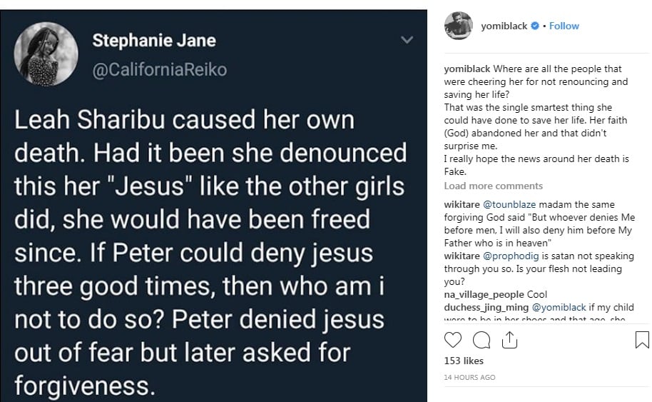 Days after Leah Sharibu’s alleged death was debunked from different quarters, a Twitter user blurted out how Leah Sharibu brought her sad ordeal in the hands of Boko Haram on herself and Nollywood actor Yomi Black seems to support.