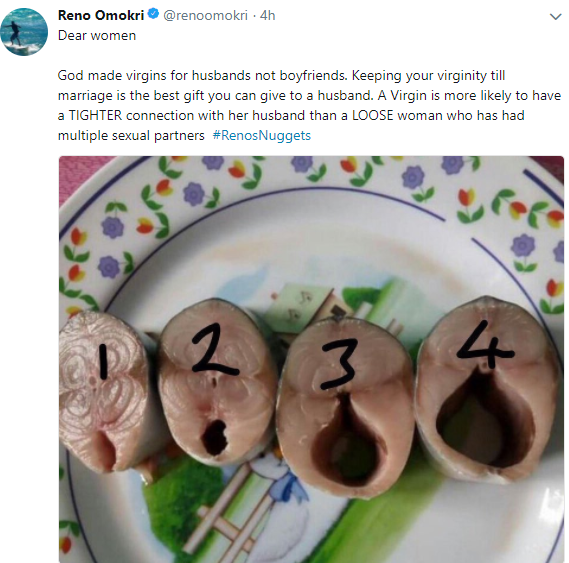 God made virgins for husbands not boyfriends. Keeping your virginity till marriage is the best gift you can give to a husband. A Virgin is more likely to have a TIGHTER connection with her husband than a LOOSE woman who has had multiple sexual partners #RenosNuggets”