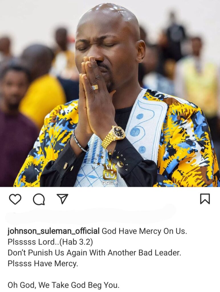Apostle Suleman, the General Overseer of Omega Fire Ministries International, posted a photo of himself in the mood of prayer and begged God to have mercy on Nigeria.