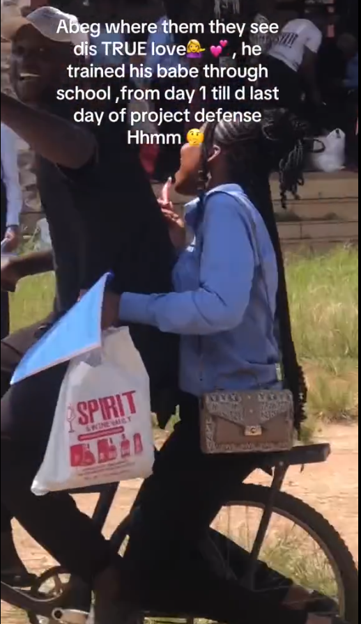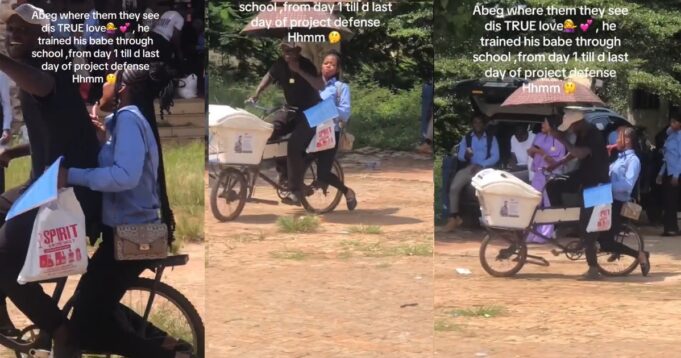In the video captioned; “abeg where them they see this TRUE LOVE, he trained his babe through school from day 1 to the last day of project defense” the man and his woman rode out of the school in his work bicycle.