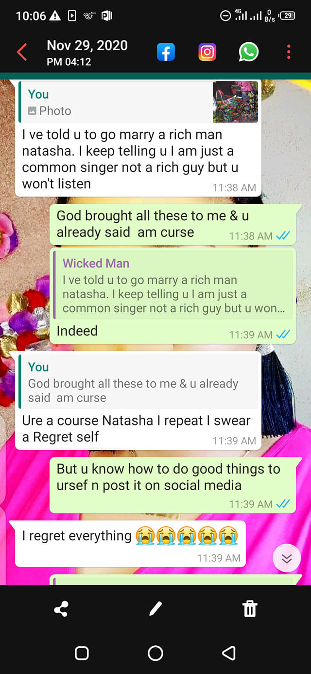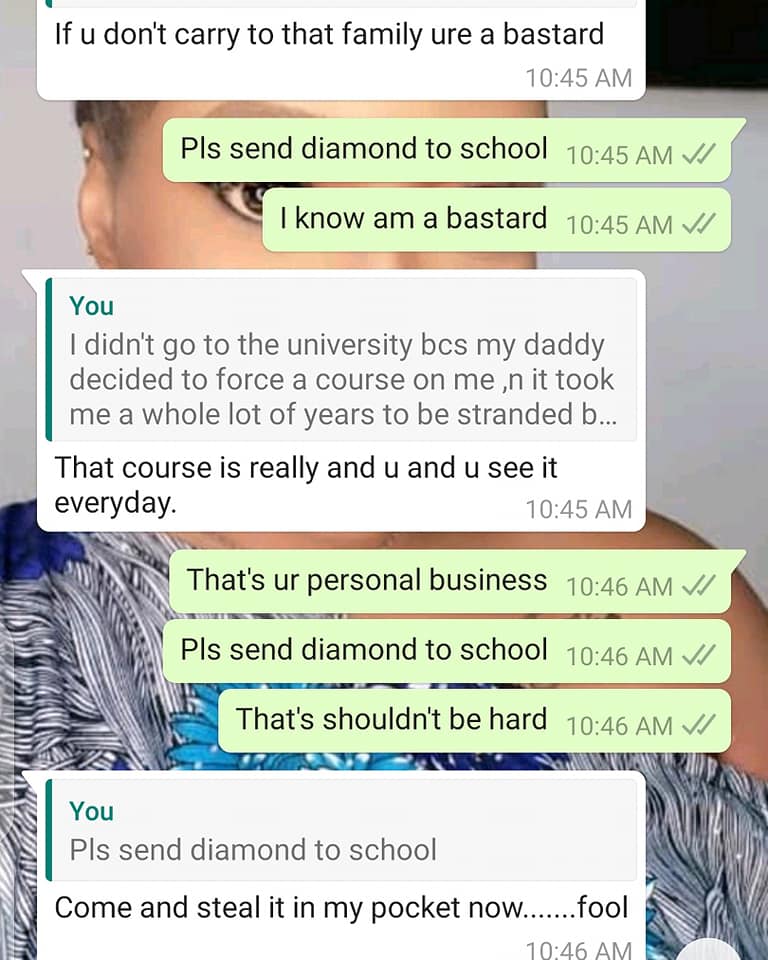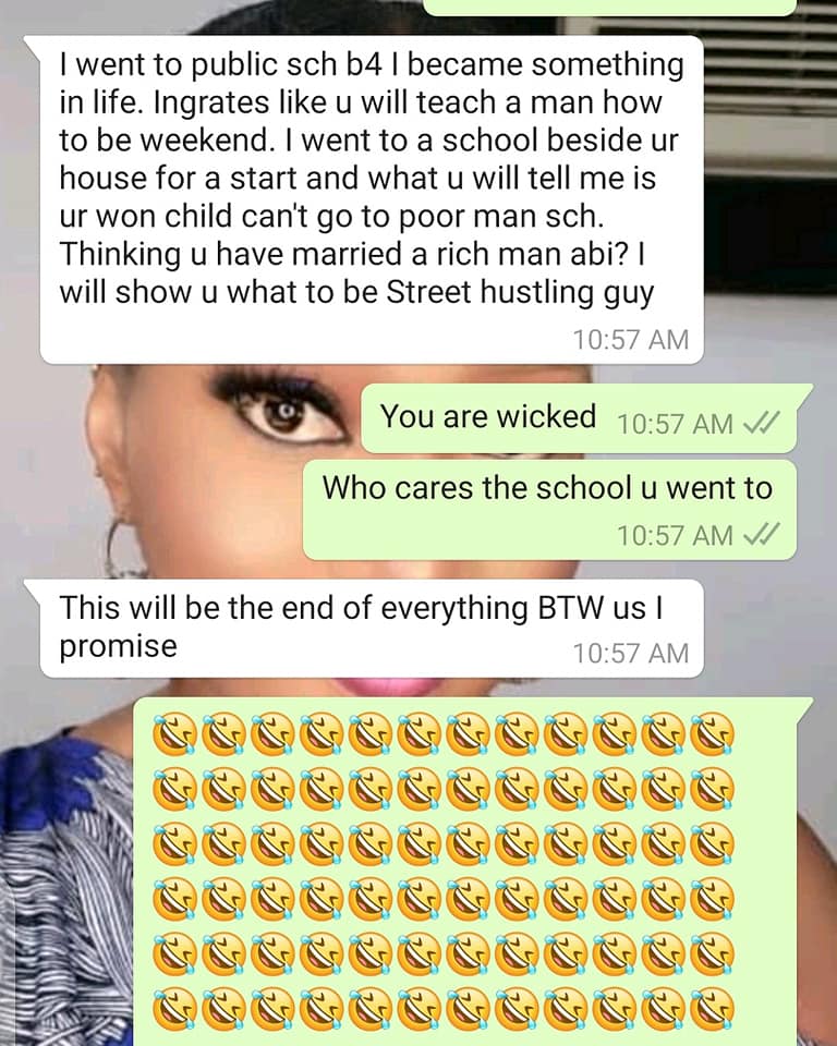 To corroborate her claims she shared screenshots of their alleged chat where the singer insisted that she enrolls their children in a government school, since he graduated from one.