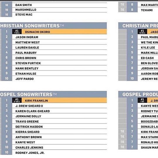 “So apparently We have been No 1 on billboard USA for Christian song writer for 7 weeks!! Look at God!! First Black person