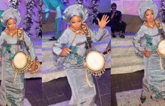 Beautiful bride stún guests with her talking-drum skill (VIDEO)