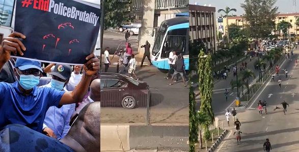 Earlier today, a video which captured the moment some hoodlums alighted from a registered Lagos BRT bus, to attack peaceful protesters in the Alausa area of the state, made rounds on social media.