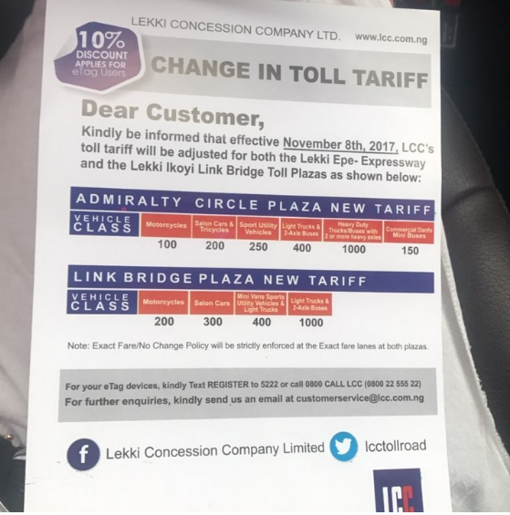 She took to her Instagram page to share a picture of the Lekki Concession Centre, informing Lagos motorists of their plan to increase the fare on Admiralty toll gate and Lekki-Ikoyi Link bridge toll gate from November 8th 2017.