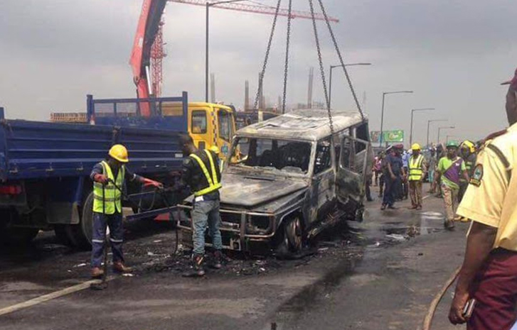 Ekiti state Governor, Ayo Fayose miraculously escaped death in Lagos when a white Mercedes Benz G-Wagon belonging to him was engulfed in a strange and inexplicable fire and completely burnt down along Oshodi-Oworonshoki Expressway on Tuesday.