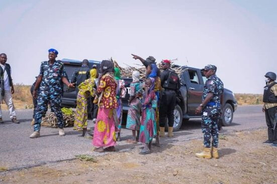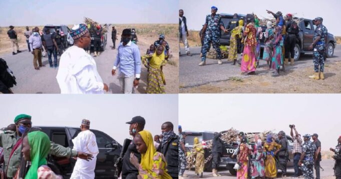 Viral photos has captured the moment Borno State governor, Babagana Zulum stopped his convoy to help some women who were gathering firewood by the roadside.