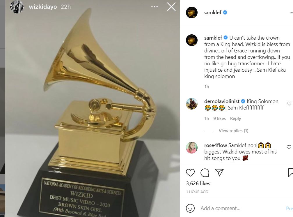 “U can’t take the crown from a King head. Wizkid is bless from divine.. oil of Grace running down from the head and overflowing.. if you no like go hug transformer.. I hate injustice and jealousy .. Sam Klef aka king solomon”