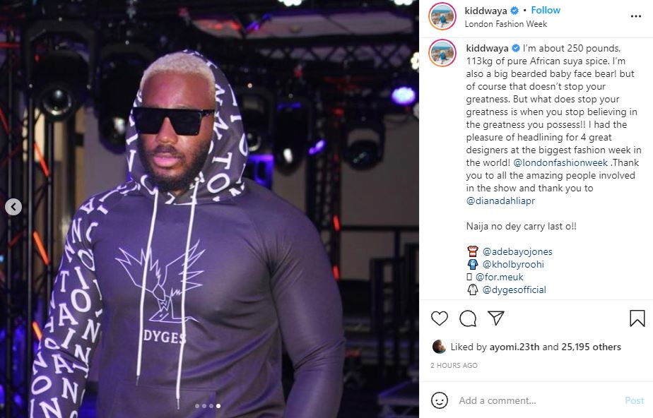BBNaija star, Kiddwaya has taken to social media to motivate his followers after he defied all odds to model for 4 designers at London Fashion Week.