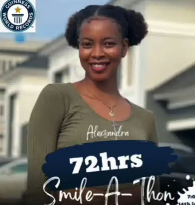 A young Nigerian lady has embarked on a 72-hour smile-a-thon in an attempt to break the Guinness World Record for the longest duration of continuous smiling.