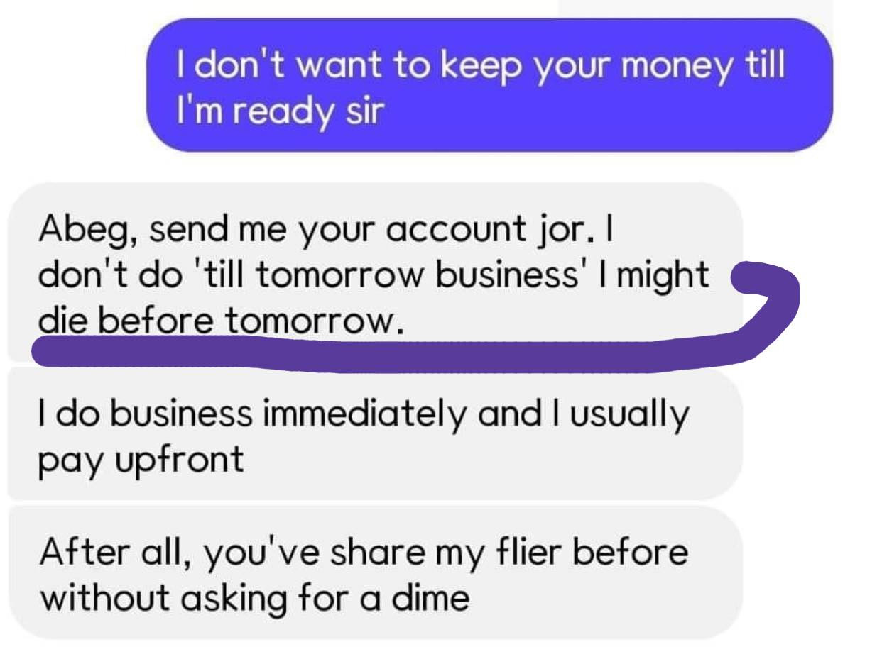 He shared a screenshot of the last conversation he had with Sulaiman, where he requested to make payment for a service immediately stating that he may not be alive the next day.