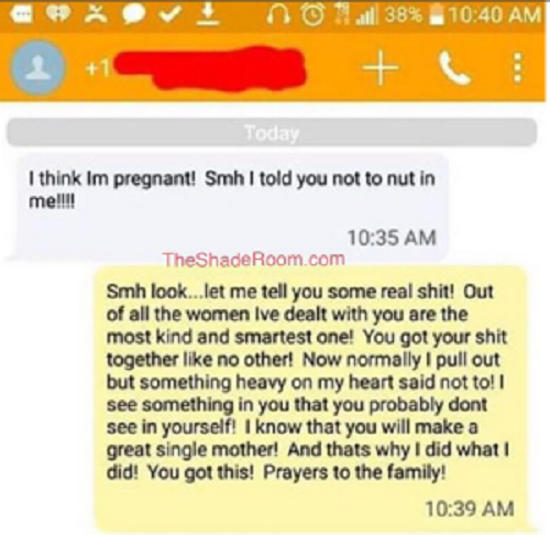 Guys Reply: Smh look…let me tell you some real shit! Out of all the women ive dealt with you are the most kind and smartest one! You got your sht together like no other! Now normally I pull out but something heavy on my heart said not to! I see something in you that you probably dont see in yourself! I know that you will make a great single mother! And thats why i did what I did! You got this! Prayers to the family!