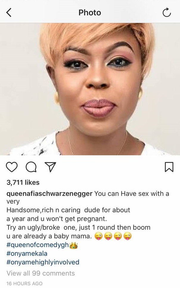 Controversial Ghanaian Actress, and on-air personality, Comedienne Afia Schwarzenegger has shared one of her numerous relationship advise on social media.. and this time, she’s talking about being intimate with a Handsome guy versus the Ugly one.