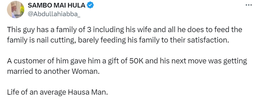 “This guy has a family of 3 including his wife and all he does to feed the family is nail cutting, barely feeding his family to their satisfaction. A customer of his gave him a gift of 50K and his next move was getting married to another Woman. Life of an average Hausa Man.”