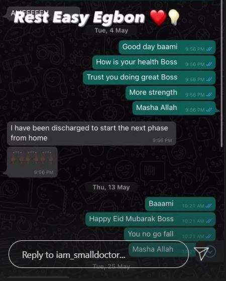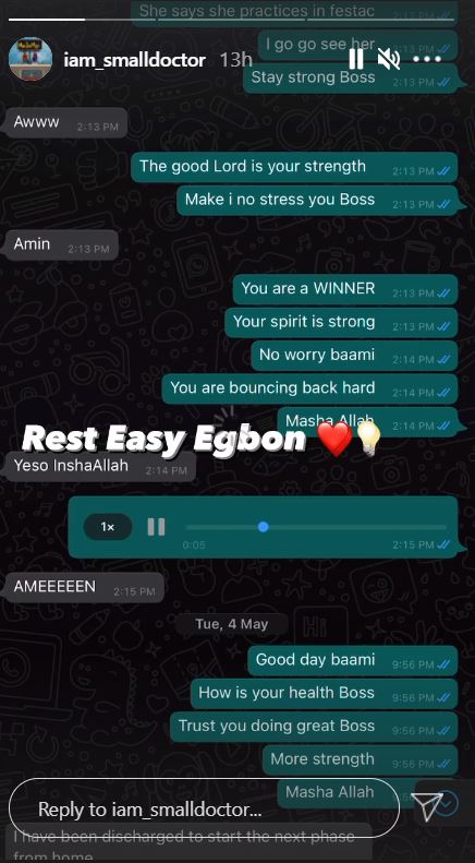 Sharing a screenshot of his last conversations with the late singer, Small Doctor captioned it, “Rest easy bro”.