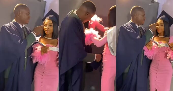 In a video shared online, the lady and her man are seen wearing graduation robes and acting lovey-dovey while preparing for their photo shoot.