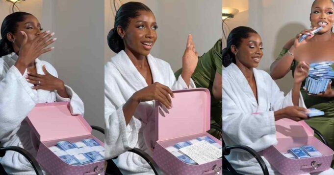 In a heartfelt video, the dressed-up bride received a surprise: a customized pink box filled with bundles of ₦1,000 notes and a handwritten note from her husband, just as she was preparing for her photo session.