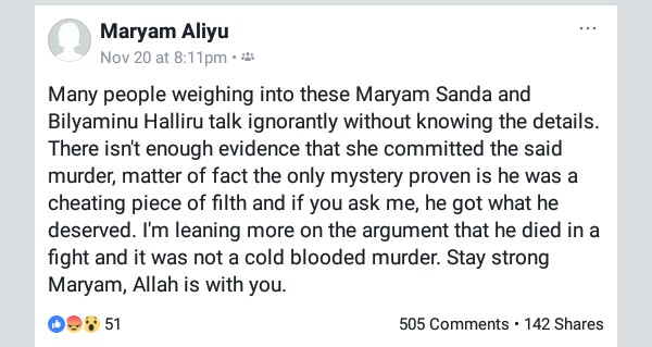 “Many people weighing into these Maryam Sanda and Bilyaminu Halliru talk ignorantly without knowing the details. There isn’t enough evidence that she committed the said murder, matter of fact the only mystery proven is he was a cheating piece of filth and if you ask me, he got what he deserved. I’m leaning more on the argument that he died in a fight and it was not a cold blooded murder. Stay strong Maryam, Allah is with you.”