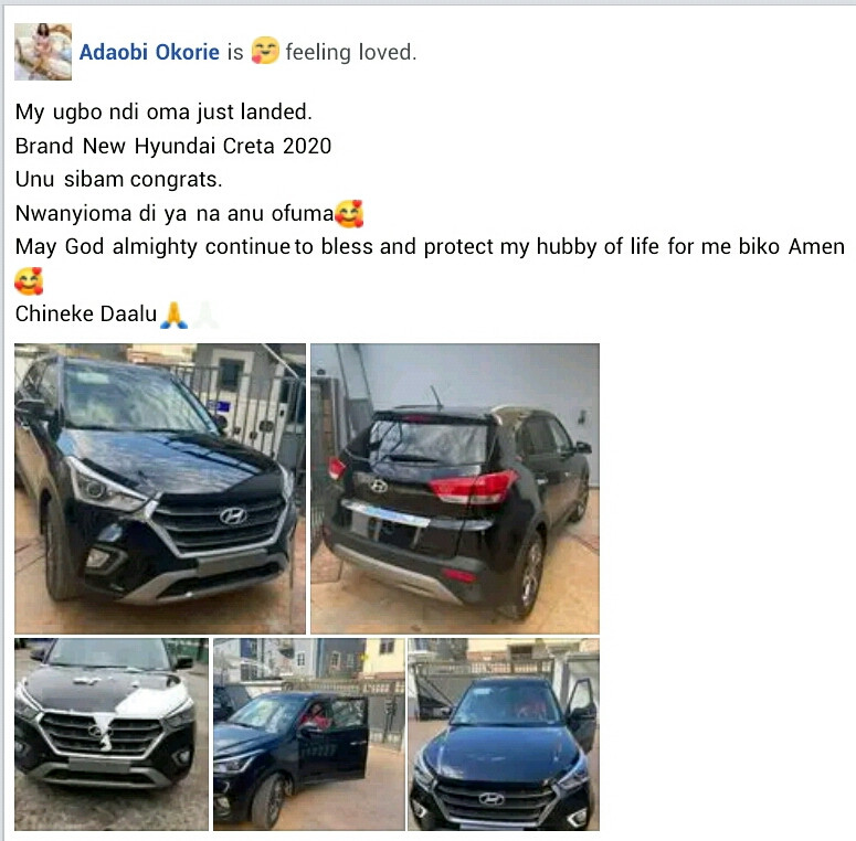 Adaobi had taken to her Facebook page on Saturday, June 12, to flaunt the brand new Hyundai Creta 2020 that her husband gifted her and described herself as a woman well loved by her man.