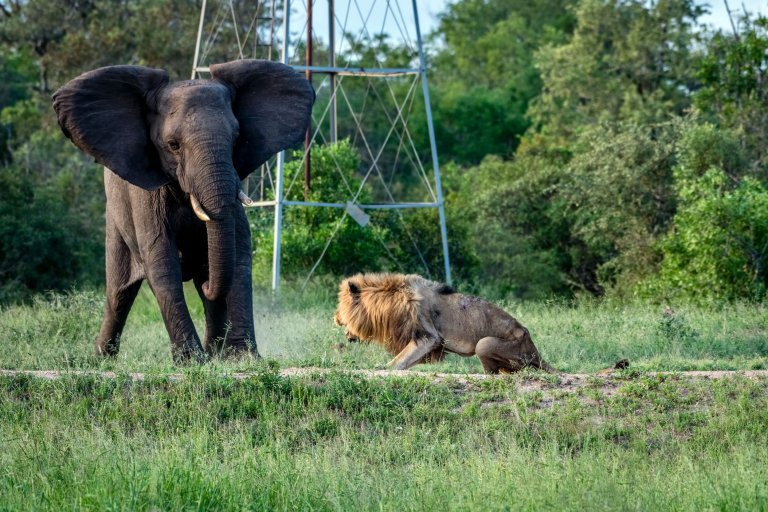 Photographer Larry Anthony Pannell, 64, watched him for hours saying he knew he was ‘witnessing something very special – the real nature both life and death’. The elderly lion was being chased by an elephant and appeared weak and starving.