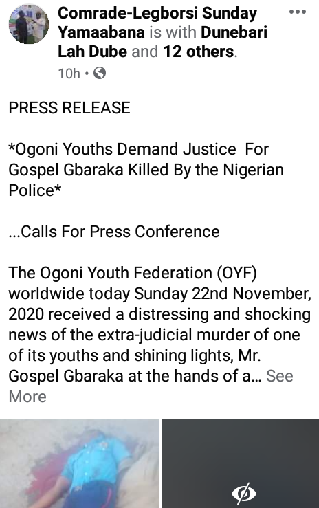 “The Ogoni Youth Federation (OYF) worldwide today Sunday 22nd November, 2020 received a distressing and shocking news of the extra-judicial murder of one of its youths and shining lights, Mr. Gospel Gbaraka at the hands of a gun-wielding member of the Nigerian Police Force, one Inspector James, serving at the Marine Base Police Station in Port Harcourt, Rivers State, now being detained at the Mile One Police Station,”