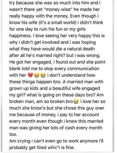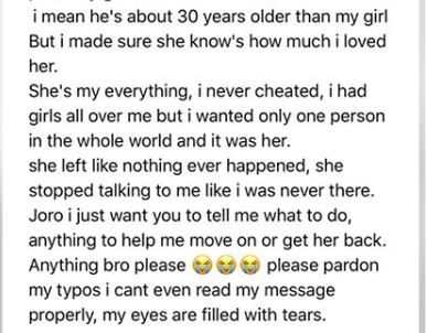 A man has been left heartbroken after an elderly man who is 30 years older than his girlfriend snatched her from him with the power of money.