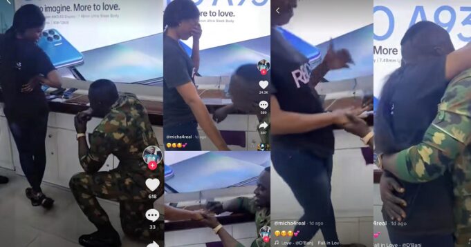 A viral video has captured the moment a Nigerian soldier surprised his girlfriend with a ring at her workplace and proposed to her.