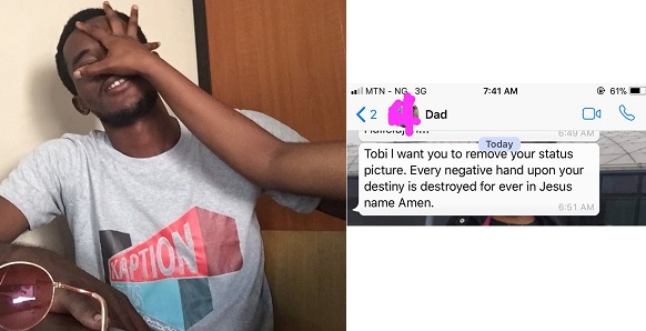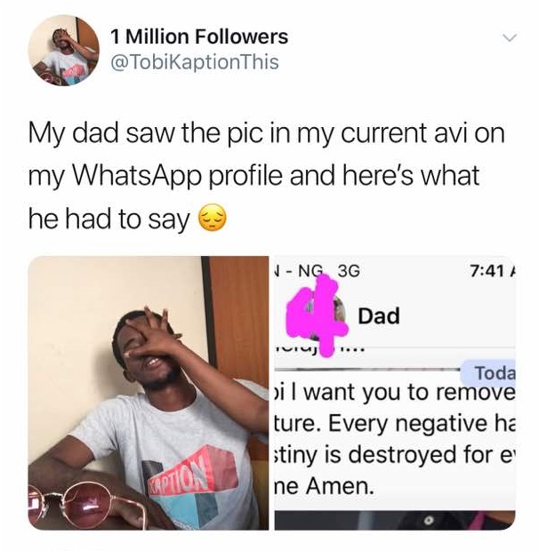 A Young man on twitter has shared the message his father sent via WhatsApp after his father saw the son’s current Display Picture on which his was covered by what seemed to a female hand