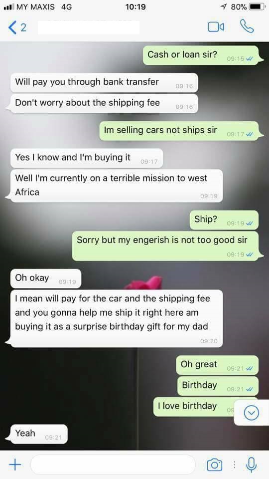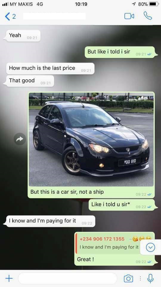 The client then proposes a payment method and says the merchant, shouldn’t be worried about shipping fees, as he’ll take care of that by himself – this was where things got really hysterical as the dealer couldn’t understand what his client meant by ‘shipping’.