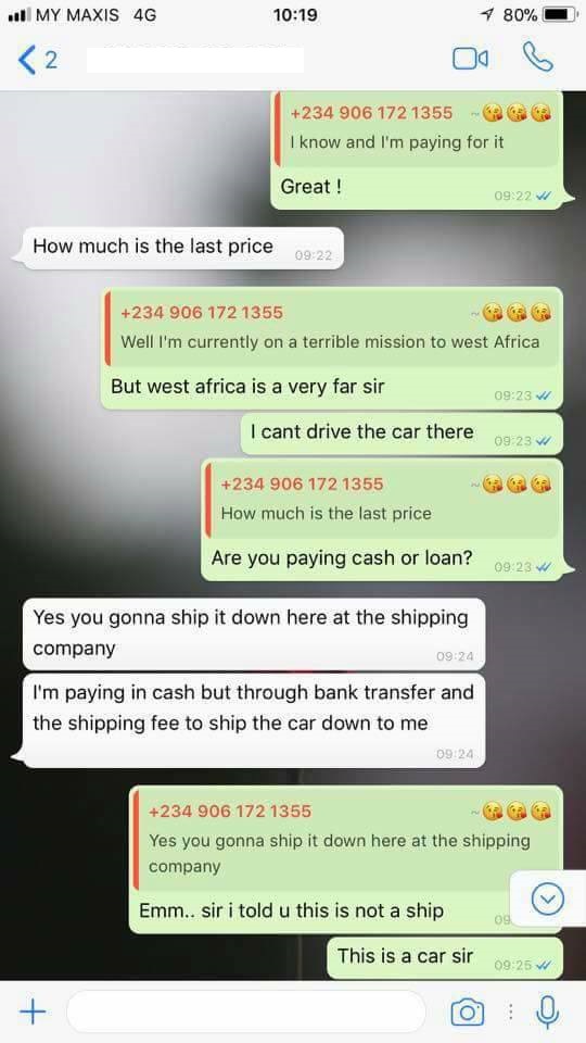 In the same vein, find below a Whatsapp conversation between a Nigerian car dealer, possibly a scammer and a potential client.. The conversation got us cry-laughing…