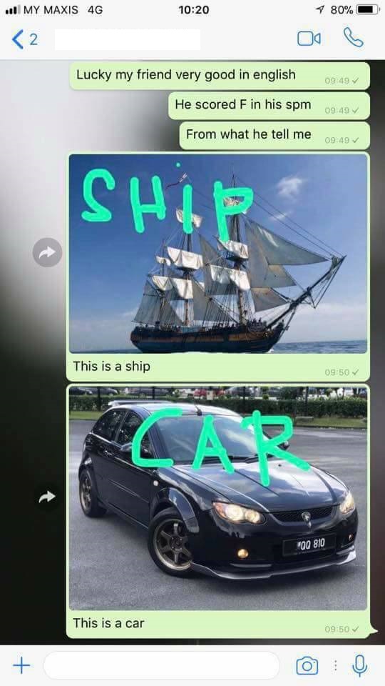 He mistook the ‘ship’ as a noun – ‘ship’ on the sea – and even went further to explain to his client that he’s selling a car to him and not a ship.
