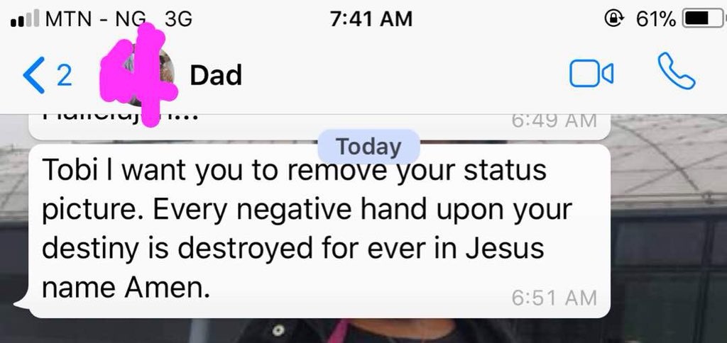 Tobi I want you to remove your status picture, Every Negative hand upon your destiny is destroyed for ever in Jesus name Amen