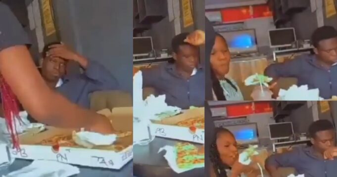 The man did not utter a word when the lady’s friends approached the table and ransacked the pizza they’d bought but his face was like a picture painting more than a thousand words.
