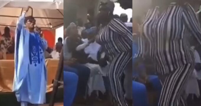 In Yoruba, he’s heard asking what kind of a woman she is who doesn’t realize they’re in the middle of a sermon and are fasting as well. He’s also heard asking what kind of clothes she’s putting on that highlights all her curves — the moment he voiced out, the crowd burst out into laughter and the lady is seen quickly going away from his presence.
