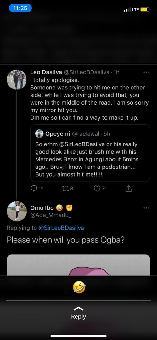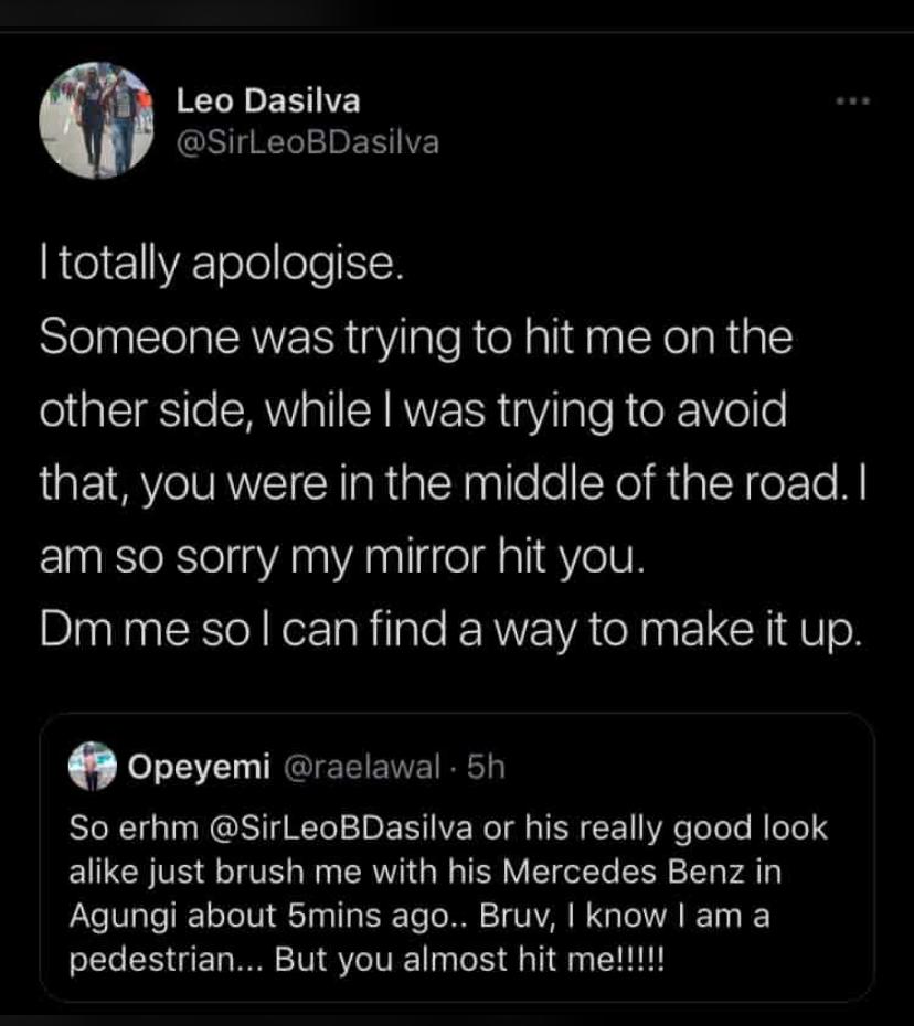 “So erhm @SirLeoBDasilva or his really good look alike just brush me with his Mercedes Benz in Agungi about 5mins ago.. Bruv, I know I am a pedestrian… But you almost hit me!!!!!”