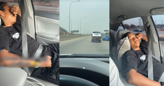 The lady identified as @nor_mad_ shared a video of her boyfriend sleeping peacefully in the car while she carefully drove on the highway leading to their destination.