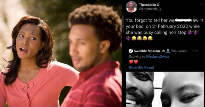 Reacting to his post, the said lady identified as @Thembisile_Q on the platform, disclosed that she had raw sex with the lover boy in February 2022, while his girlfriend kept calling him.