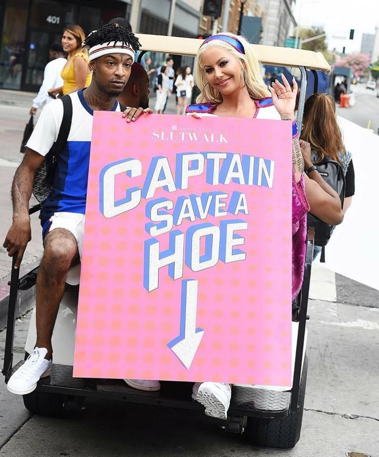 While Amber was dressed in a sexy superhero alter ego costume with a cape which says “Captain Save a Hoe”, the rapper held up a sign which says, “I’m a HOE too. ”