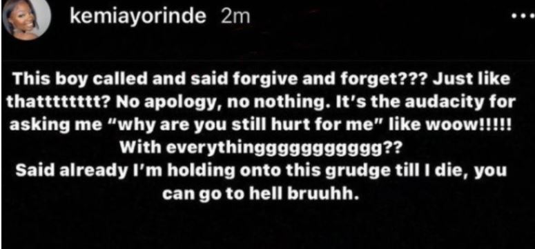 Questioning his audacity for making such a demand when he hasn’t apologized for his actions, Kemi stated that she will hold to the grudge she has against him till she dies.
