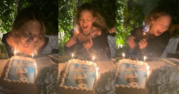 As she leaned in to blow out the candles, her hair accidentally caught fire. When the television personality noticed that the tips of her hair was on fire, she let out a scream as someone next to her batted out the flames.